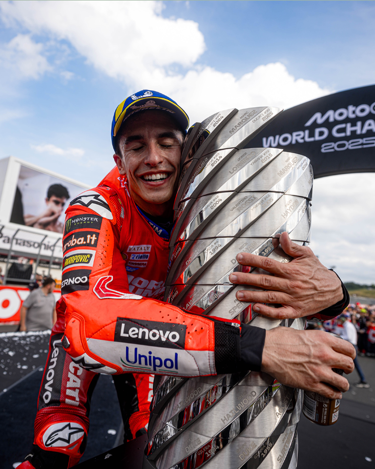 A tribute to the extraordinary achievement of Marc Márquez, who won his seventh world title with his Desmosedici GP25, contributing to Ducati’s fourth consecutive MotoGP title. Another unforgettable page in racing history has been written.