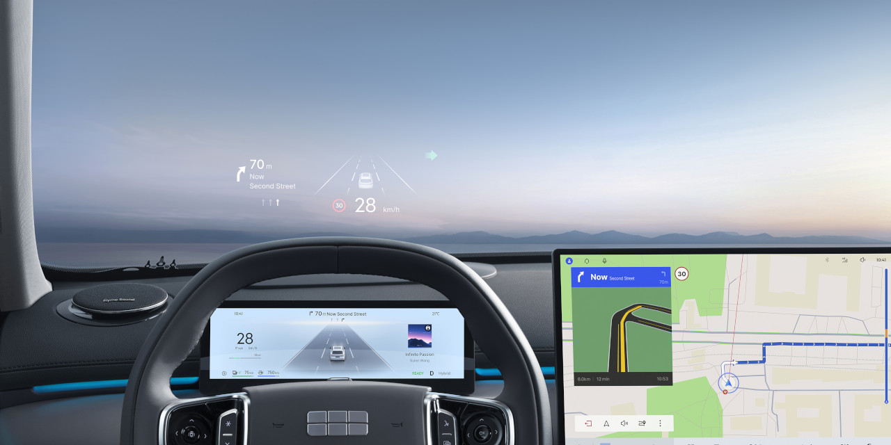 The Geely EX5 EM-i features the cutting-edge Flyme Auto intelligent cockpit system. It delivers a tri-screen interactive experience through a 10.2-inch fully digital instrument cluster, a 15.4-inch ultra-narrow bezel central display, and a 13.8-inch W-HUD head-up display. The center display utilizes premium LTPS LCD technology with an impressive 85.08% screen-to-body ratio, delivering exceptionally smooth and detailed visuals. The HUD boasts an astonishing brightness of 12,000 nits, ensuring crystal-clear visibility even under direct sunlight.